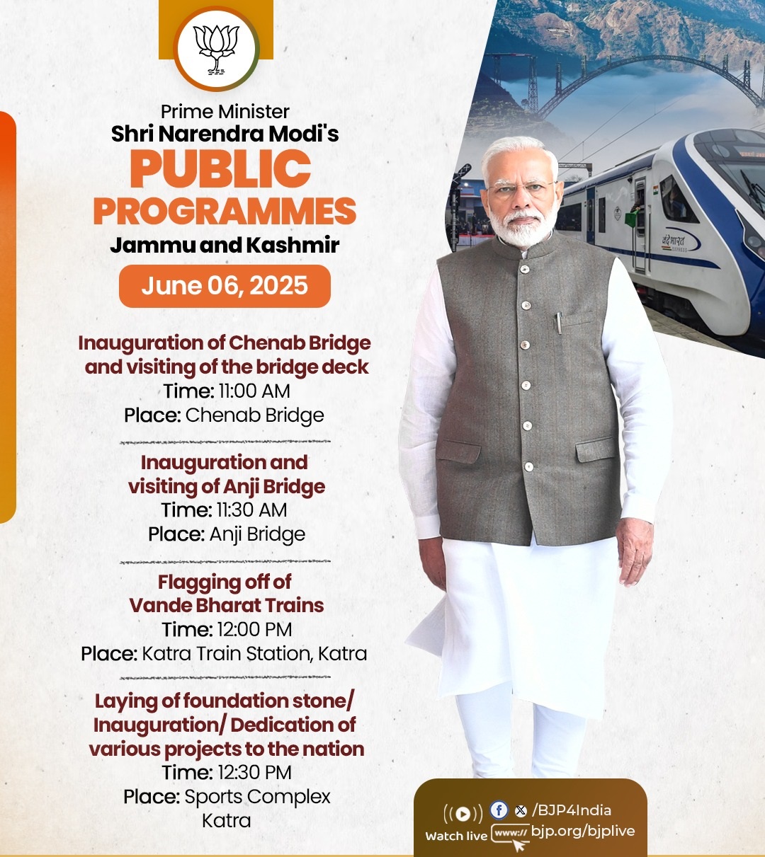 प्रधानमंत्री मोदी के आज के कार्यक्रम का ब्यौरा भारतीय जनता पार्टी (भाजपा) ने एक्स हैंडल पर साझा किया है। प्रवक्ता के अनुसार, इस अवसर पर प्रधानमंत्री नरेन्द्र मोदी दो वंदे भारत एक्सप्रेस ट्रेनों को हरी झंडी दिखाएंगे। यह कटरा और श्रीनगर के बीच चलेंगी। इन ट्रेनों से यात्रा करने में सिर्फ तीन घंटे लगेंगे। मौजूदा यात्रा समय में दो से तीन घंटे की कमी आएगी। प्रधानमंत्री मोदी अन्य कई विकास परियोजनाओं का शिलान्यास और उद्घाटन भी करेंगे।