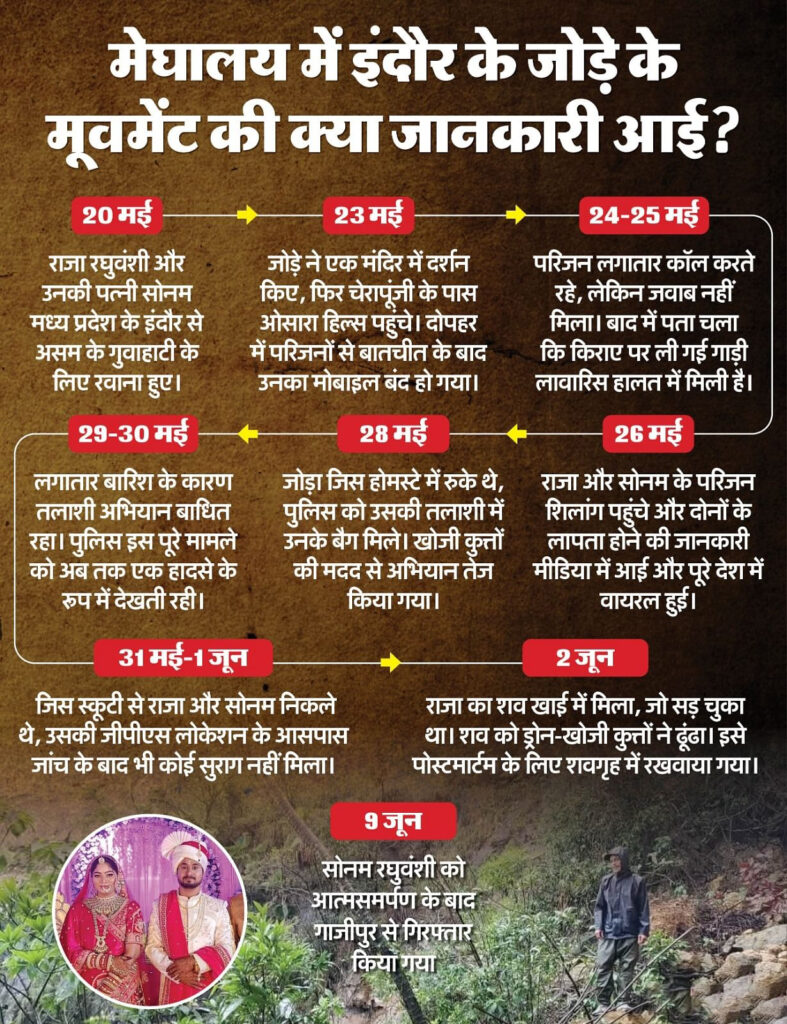 इंदौर के इस जोड़े के लापता होने का केस राजा का शव मिलने के बाद और उलझ गया था। दरअसल, भारी बारिश के बीच मेघालय पुलिस ने ड्रोन्स के जरिए राजा का शव ढूंढा। उनका शव बुरी तरह सड़ चुका था और चेहरा पहचान में नहीं आ रहा था। परिजनों ने एक टैटू के जरिए शव की पहचान की। हालांकि, राजा के शव के आसपास खोजबीन पर भी सोनम का कुछ पता नहीं चला था। परिजनों का कहना था कि अगर सोनम सुरक्षित होती तो खुद ही किसी से संपर्क करती, लेकिन उसका कोई पता नहीं है।