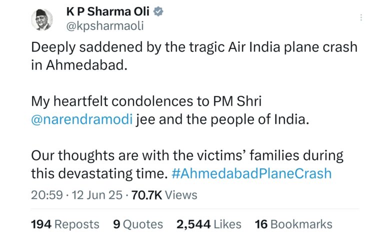 प्रधानमंत्री ओली ने भारतीय प्रधानमंत्री नरेन्द्र मोदी को भेजे शोक संदेश में अहमदाबाद विमान दुर्घटना पर दुख प्रकट किया है। ओली ने नरेन्द्र मोदी और भारत के लोगों के प्रति संवेदनाएं प्रकट की है। ओली ने लिखा है कि इस विनाशकारी समय में हमारी संवेदनाएं पीड़ितों के परिवारों के साथ हैं। नेपाल के विदेश मंत्रालय ने भी बयान जारी करते हुए अहमदाबाद विमान दुर्घटना पर गहरा दुख प्रकट किया गया है।