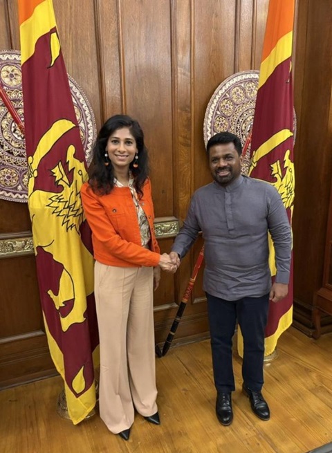 डेली मिरर अखबार की खबर के अनुसार डॉ. गोपीनाथ ने सबसे पहले राष्ट्रपति दिसानायके से मुलाकात की। दोनों पक्षों ने आर्थिक सुधारों को लागू करने में श्रीलंका की उत्साहजनक प्रगति पर चर्चा की। डॉ. गोपीनाथ ने एक्स पोस्ट पर कहा कि उन्हें राष्ट्रपति से मिलकर खुशी हुई। चर्चा श्रीलंका के आर्थिक सुधारों पर मजबूत प्रदर्शन और इस गति को बनाए रखने के महत्व पर केंद्रित रही।