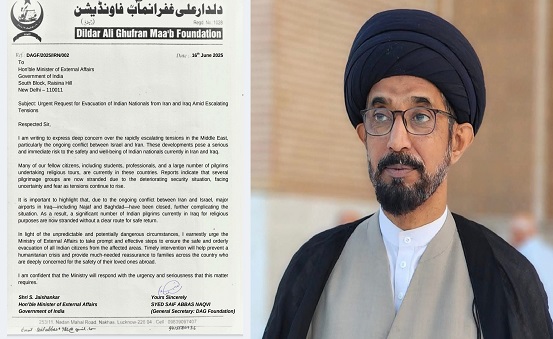 नई दिल्ली : ईरान-इजरायल युद्ध के बीच भारत से ईरान-इराक गए तीर्थ यात्रियों और दोनों देशों के विश्वविद्यालय में शिक्षा प्राप्त करने वाले छात्र-छात्राओं को सकुशल भारत वापस लाने के लिए प्रयास तेज हो गए हैं। शिया धर्म गुरु मौलाना सैफ अब्बास नकवी ने विदेश मंत्री एस जयशंकर को पत्र लिखकर ईरान, इराक में फंसे तीर्थ यात्रियों और छात्रों को भारत वापस लाने की अपील की है। उन्होंने पत्र लिखकर विदेश मंत्री को सारे हालात से आगाह किया है।