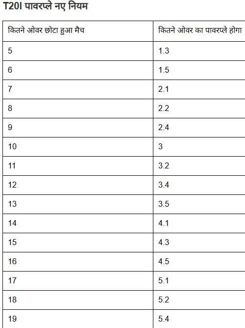 एक क्रिकेट साइट के अनुसार आईसीसी ने सदस्यों को बताया, “इंग्लैंड में टी20 ब्लास्ट में कई सालों से इस तालिका का उपयोग किया जा रहा है, जहां ओवर के बीच में पावरप्ले समाप्त करने से खिलाड़ियों या अधिकारियों को कोई परेशानी नहीं होती है।