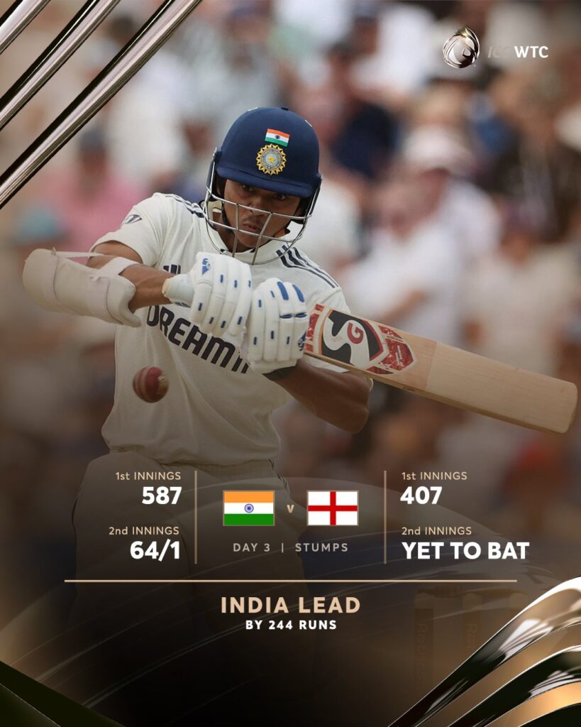 पहली पारी में 587 रन बनाने वाली टीम इंडिया की बढ़त 244 रन की हुई। तीसरे दिन खेल खत्म होते समय केएल राहुल 28 और करुण नायर सात रन बनाकर क्रीज पर थे। भारत ने सलामी बल्लेबाज यशस्वी जायसवाल (28 रन) का विकेट जोश टंग की गेंद पर गंवाया।