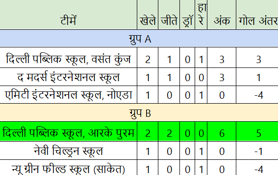 ग्रुप बी: • डीपीएस वसंत कुंज ने सेंट फ्रांसिस डी सेल्स सीनियर सेकेंडरी स्कूल को 1-0 से हराया