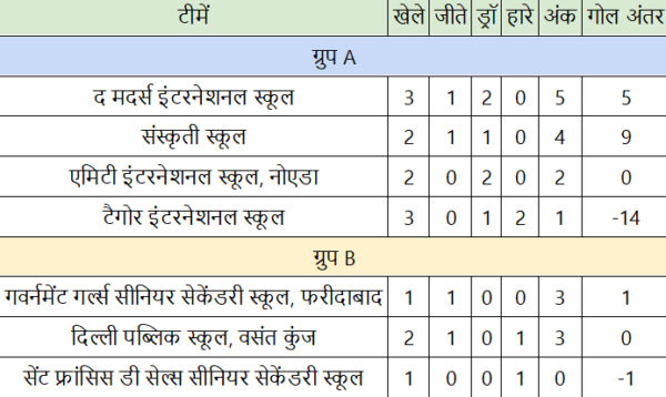 ग्रुप ए: • द मदर्स इंटरनेशनल स्कूल ने टैगोर इंटरनेशनल स्कूल को 5-0 से हराया