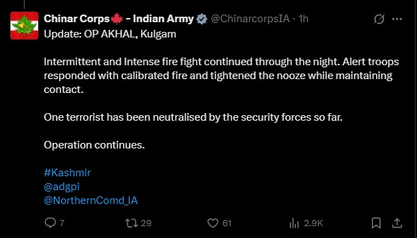 भारतीय सेना की चिनार कॉर्प्स ने एक्स पोस्ट में बताया है कि भारतीय सेना, जम्मू-कश्मीर पुलिस और केंद्रीय रिजर्व पुलिस बल (सीआरपीएफ) की संयुक्त टीम ने आतंकियों की मौजूदगी की सूचना पर दक्षिण कश्मीर के जंगल क्षेत्र में घेराबंदी और सर्च ऑपरेशन शुरू किया। इसी दौरान आतंकियों ने सुरक्षाबलों पर अंधाधुंध गोलीबारी शुरू कर दी, जिसकी जवाबी कार्रवाई में सुरक्षाबलों ने एक आतंकी को ढेर कर दिया। अभी ऑपरेशन जारी है।