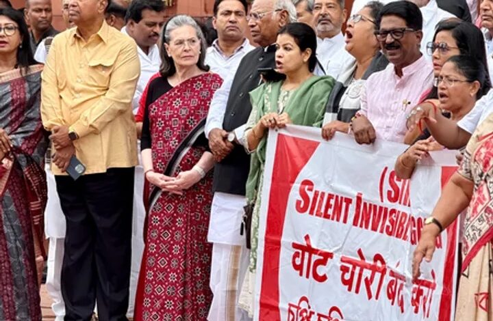 नई दिल्ली : चुनावों में कथित धांधली, वोट चोरी और एसआईआर प्रक्रिया पर राजनीतिक हंगामा बरकरार है। इसी क्रम में मंगलवार को विपक्ष के सदस्यों ने संसद के बाहर विरोध प्रदर्शन किया, जिसमें सोनिया गांधी और मल्लिकार्जुन खड़गे समेत इंडिया ब्लॉक के लगभग सभी सदस्यों ने हिस्सा लिया। विपक्ष 124 साल की मिंता देवी की टी-शर्ट पहनकर आया, जिनका कथित तौर पर फर्स्ट वोटर में नाम दर्ज है। विपक्ष का आरोप है कि भाजपा और चुनाव आयोग मिलकर वोट चोरी कर रहे हैं, जनता के अधिकार छीन रहे हैं।