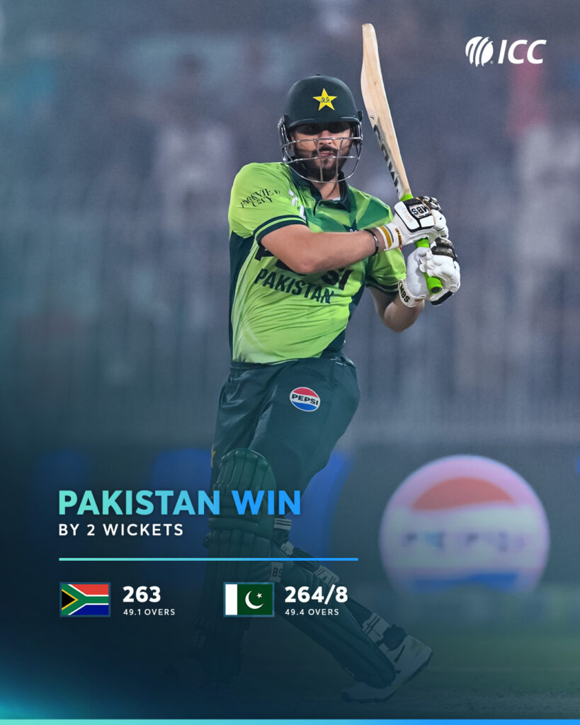 पाकिस्तान ने दक्षिण अफ्रीका के खिलाफ एक रोमांचक पहले वनडे में अंतिम ओवर तक लड़ाई लड़ते हुए दो विकेट से जीत दर्ज की। मैच विशेष रूप से पाकिस्तान के निचले क्रम के बल्लेबाजों की संजीवनी भूमिका के कारण यादगार रहा। पाकिस्तान को 264 रनों का पीछा करना था।