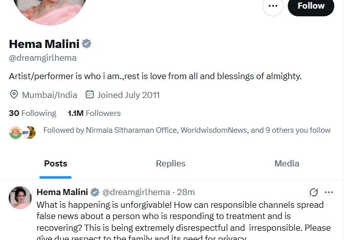 मुंबई : वरिष्ठ और दिग्गज अभिनेता धर्मेंद्र के स्वास्थ्य में धीरे-धीरे सुधार हो रहा है। मीडिया में अचानक उनके मौत की खबर प्रसारित होने पर उनकी पत्नी अभिनेत्री और सांसद हेमा मालिनी ने हस्तक्षेप किया। उन्होंने आज सुबह लगभग पौने 10 बजे एक्स हैंडल पर इस पर कड़ा विरोध जताया और अभिनेता धर्मेंद्र के निधन की खबर का खंडन किया।हेमा मालिनी ने एक्स पर लिखा, ”जो हो रहा है वो अक्षम्य है! जिम्मेदार चैनल ऐसे व्यक्ति के बारे में झूठी खबर कैसे फैला सकते हैं जिस पर इलाज का असर हो रहा है और वह ठीक हो रहा है? यह बेहद अपमानजनक और गैरजिम्मेदाराना है। कृपया परिवार और उनकी निजता की जरूरत का पूरा सम्मान करें।” अभिनेत्री ने लोगों से अपील की है कि इन पलों में सब लोग उनकी निजता का पूरा सम्मान और ख्याल रखें।इस बारे में ईशा देओल ने भी अपडेट दिया है। उन्होंने सोशल मीडिया पोस्ट में लिखा, ”मीडिया गलत खबरें फैलाने की तेजी में हैं। मेरे पिता स्थिर हैं और रिकवर कर रहे हैं। हम सभी से रिक्वेस्ट करते हैं कि हमारे परिवार को प्राइवेसी दें। पापा की जल्द रिकवरी के लिए प्रार्थनाओं के लिए थैंक्यू।”—————