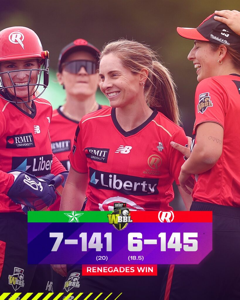 मेलबर्न रेनेगेड्स ने विमेंस बिग बैश लीग में मेलबर्न स्टार्स को 4 विकेट से हराकर अंक तालिका में दूसरा स्थान मजबूत किया। इस जीत के साथ रेनेगेड्स ने इस सीजन 4 में से 3 मैच जीतने का रिकॉर्ड बना लिया है।