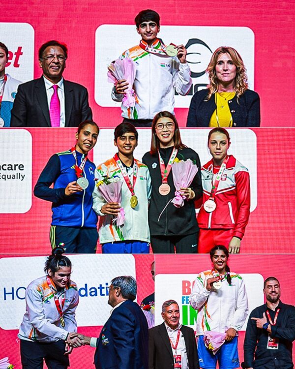 ग्रेटर नोएडा : भारत की महिलाओं ने वर्ल्ड बॉक्सिंग कप फाइनल्स 2025 में देश के लिएउस समय एक ऐतिहासिक दिन बनाया, जब मीनाक्षी (48 किग्रा), प्रीति (54 किग्रा), अरुंधति चौधरी (70 किग्रा), और नूपुर (80+ किग्रा) ने शहीद विजय सिंह पथिक स्पोर्ट्स कॉम्प्लेक्स में खचाखच भरे स्टेडियम के सामने स्वर्ण पदक जीते।