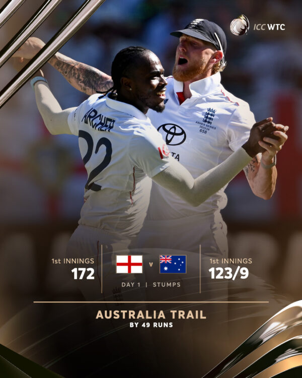 इंग्लैंड की ओर से कप्तान बेन स्टोक्स ने जबरदस्त प्रतिकार किया और 5 विकेट लेकर ऑस्ट्रेलियाई टीम को दबाव में डाल दिया। जोफ्रा आर्चर और ब्रायडेन कार्स ने 2-2 विकेट लेकर मैच को और रोमांचक बना दिया।