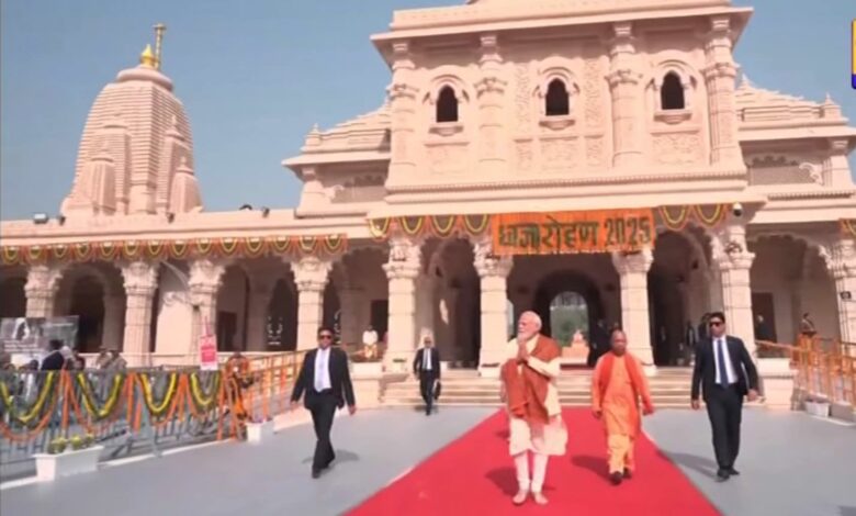 अयोध्या : अयोध्या में भगवान श्रीराम के मंदिर के मुख्य शिखर पर मंगलवार को अभिजित मुहूर्त में केसरिया रंग की धर्म ध्वजा स्थापित हो गई। प्रधानमंत्री नरेन्द्र मोदी ने शिखर पर भगवा ध्वज फहराया। इस दौरान मंदिर परिसर का माहौल भक्तिमय और उत्साह से भरा रहा।इससे पहले रामनगरी पहुंचे प्रधानमंत्री मोदी का जोरदार स्वागत हुआ। जयश्रीराम, जय-जय हनुमान के गगनभेदी नारों संग अयोध्यावासियों ने प्रधानमंत्री के काफिले पर पुष्पवर्षा की। प्रधानमंत्री का पूरे रास्ते में अभूतपूर्व स्वागत किया गया। स्वागत से अभिभूत प्रधानमंत्री ने भी हाथ हिलाकर अयोध्यावासियों का अभिवादन किया। अयोध्या पहुंचने पर मुख्यमंत्री योगी आदित्यनाथ और राज्यपाल आनंदी बेन पटेल ने प्रधानमंत्री का स्वागत किया।अयोध्यावासियों के एक हाथ में भगवा ध्वज तो दूसरे में तिरंगाप्रधानमंत्री मोदी आज सुबह अयोध्या पहुंचे। साकेत महाविद्यालय पर उनका हेलीकॉप्टर उतरा। वहां से काफिले संग टेढ़ी बाजार होते हुए उन्होंने श्रीराम मंदिर परिसर में प्रवेश किया। इस दौरान अयोध्यावासियों ने जयश्रीराम, जय जय हनुमान के गगनभेदी नारों संग उनका स्वागत किया। अयोध्यावासी एक हाथ में भगवा ध्वज तो दूसरे हाथ में तिरंगा फहराते हुए प्रधानमंत्री का स्वागत करते रहे।सप्त मंदिरों में झुकाया शीश, की पूजा-अर्चनाप्रधानमंत्री मोदी ने सप्त मंदिर में पूजा-अर्चना की। मंदिर परिसर में महर्षि वशिष्ठ, महर्षि विश्वामित्र, महर्षि अगस्त्य, महर्षि वाल्मीकि, देवी अहिल्या, निषादराज गुह्य और माता शबरी मंदिर में पहुंचकर प्रधानमंत्री ने शीश झुकाया। प्रधानमंत्री ने शेषावतार मंदिर व माता अन्नपूर्णा मंदिर में भी दर्शन-पूजन किया।इसके बाद श्री राम मंदिर परिसर में राम दरबार पहुंचकर प्रधानमंत्री मोदी, राष्ट्रीय स्वयंसेवक संघ के सरसंघचालक डॉ. मोहन भागवत और मुख्यमंत्री योगी आदित्यनाथ ने दर्शन-पूजन व आरती की। यहां पुजारियों ने तीनों विशिष्टजनों को राम नामी गमछा ओढ़ाया व प्रसाद दिया।