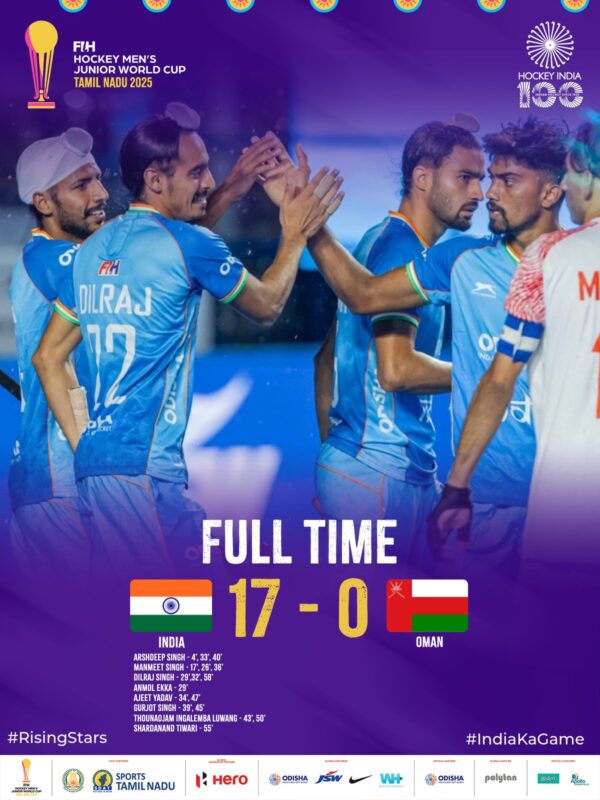 पुरुष जूनियर विश्व कप : ओमान पर भारत की 17-0 की ऐतिहासिक जीत