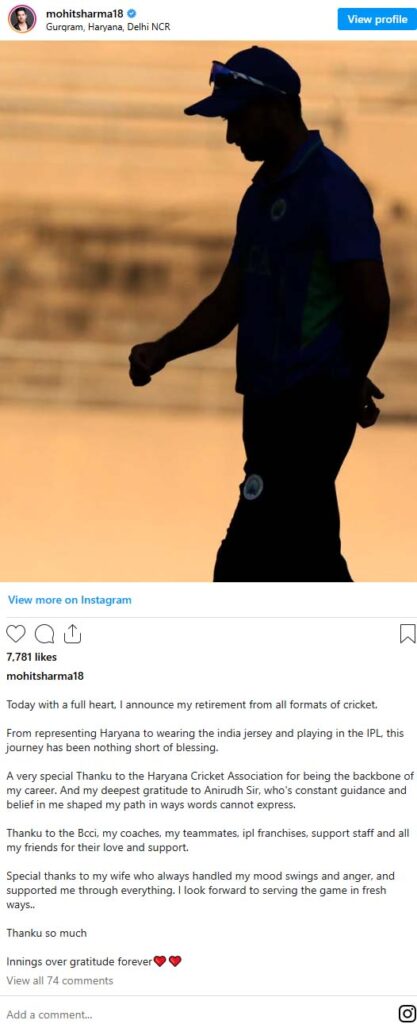 भारत के लिए 2013 में पदार्पण करने वाले मोहित ने 26 वनडे में 35 विकेट और आठ टी20 में छह विकेट झटके। वह 2015 विश्व कप टीम का हिस्सा थे और बाद में एमएस धोनी की कप्तानी में चेन्नई सुपर किंग्स के लिए डेथ ओवरों में एक भरोसेमंद गेंदबाज बनकर उभरे।