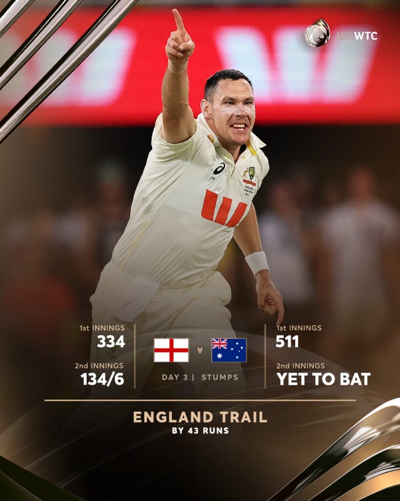 गाबा में एशेज सीरीज के दूसरे टेस्ट में ऑस्ट्रेलिया ने तीसरे दिन का खेल पूरी तरह अपने कब्ज़े में कर लिया है, जबकि इंग्लैंड लगातार दबाव में गहराता जा रहा है। दिन समाप्त होने तक इंग्लैंड अपनी दूसरी पारी में सिर्फ 134 रन पर 6 विकेट खो चुका है, और अभी भी 43 रन पीछे है।