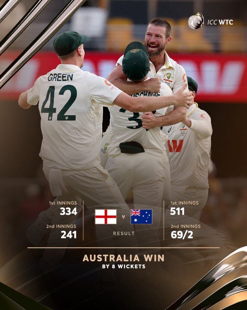 एशेज 2025 : सीरीज में 2-0 की बढ़त, ऑस्ट्रेलिया ने इंग्लैंड को आठ विकेट से हराया