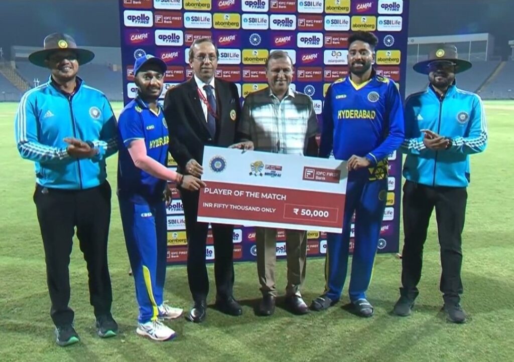 हैदराबाद के इस रनचेज के हीरो तन्मय अग्रवाल रहे थे जिन्होंने अकेले ही 75 रनों की पारी खेल डाली। मोहम्मद सिराज ने इस मैच की टोन सेट की थी, जिस वजह से उन्हें प्लेयर ऑफ द मैच के अवॉर्ड से नवाजा गया। वहीं तन्मय 75 रनों की पारी खेलने के बावजूद खाली हाथ रह गए थे।