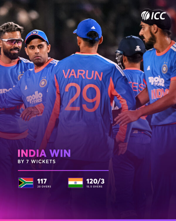 अभिषेक शर्मा ने 35 रन बनाए, वहीं शुभमन गिल ने 28 रन जोड़े। तिलक वर्मा ने 25 रन और शिवम दुबे ने 10 रन की नाबाद पारी खेलते हुए भारत को जीत दिलाई। साउथ अफ्रीका से लुंगी एनगिडी, मार्को जानसेन और कॉर्बिन बॉश ने 1-1 विकेट लिए।