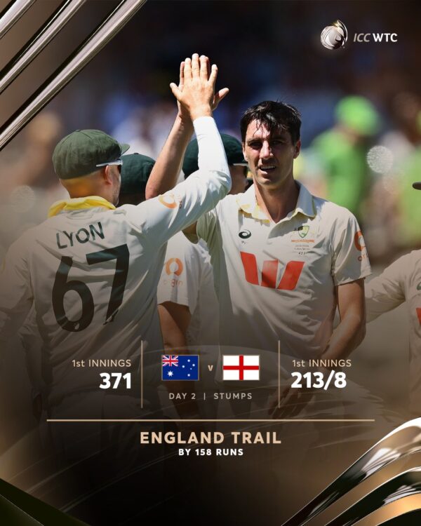 ऑस्ट्रेलिया ने पहली पारी में 371 रनों का स्कोर बना दिया, जबकि शुरुआत टीम की अच्छी नहीं थी। उधर, इंग्लैंड को अपनी पहली पारी में शुरुआत अच्छी नहीं मिली। इस तरह कहा जा सकता है कि ऑस्ट्रेलिया ने इस मैच पर भी अपनी पकड़ बना ली है।