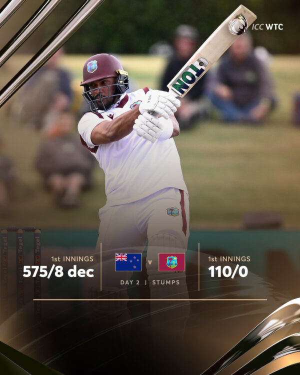 न्यूजीलैंड के 575 रन पर पहली पारी घोषित करने के बाद वेस्टइंडीज ने दूसरे दिन का खेल खत्म होने तक बिना कोई विकेट गंवाए 110 रन बना लिए हैं। ओपनिंग जोड़ी ने ठोस शुरुआत दी—जॉन कैंपबेल 45 रन और ब्रैंडन किंग 55 रन बनाकर नाबाद हैं।