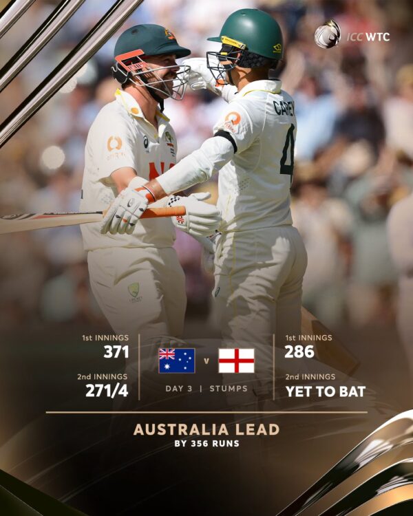 ऑस्ट्रेलिया का स्कोर तीसरे दिन के खेल के बाद 271/4 है। ऑस्ट्रेलिया के पास 356 रनों की बढ़त हो गई है, क्योंकि 85 रन इंग्लैंड के खिलाफ इस मैच में ऑस्ट्रेलिया ने पहले ही बढ़त के तौर पर हासिल कर लिए थे।