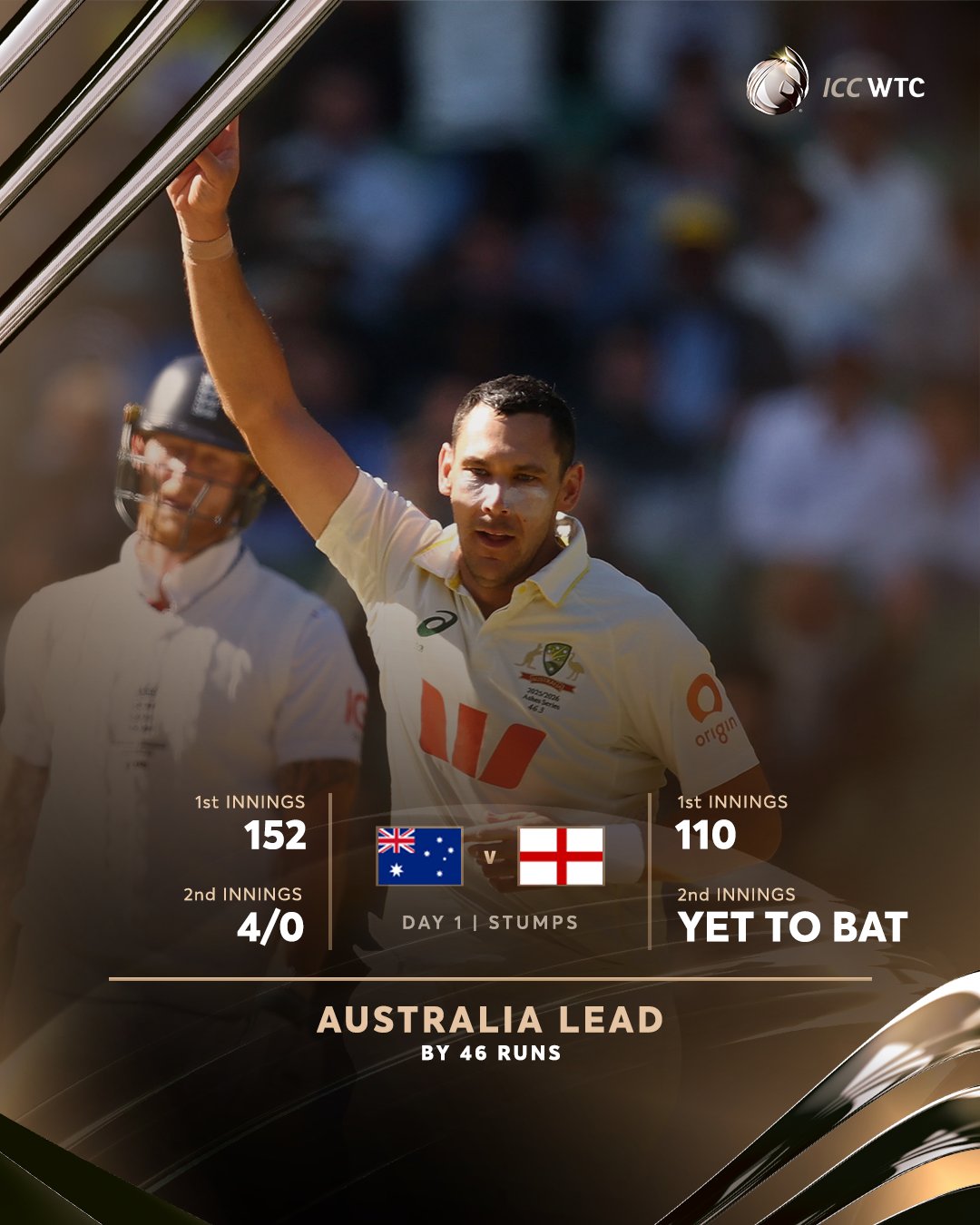 ऑस्ट्रेलिया पहले बैटिंग करते हुए 152 रन पर ढेर हो गया था, वहीं इंग्लैंड 110 पर ही सिमट गई। दिन का खेल खत्म होते-होते ऑस्ट्रेलिया को एक ओवर गेंदबाजी करनी पड़ी, हालांकि उन्होंने दूसरे ओवर में विकेट नहीं खोया।