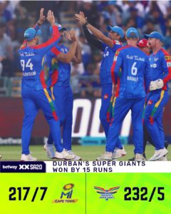 डरबन सुपर जायंट्स ने रोमांचक मैच में एमआई केपटाउन को 15 रन से हराया