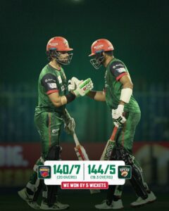 नसीम शाह ने वॉरियर्स के लिए तीन महत्वपूर्ण विकेट चटकाए और टीम को 140 रन पर रोकने में अहम भूमिका निभाई। वॉरियर्स से जॉनसन चार्ल्स ने 43 रन बनाए।