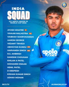 अंडर-19 वर्ल्ड कप 2026 के लिए टीम इंडिया घोषित, आयुष म्हात्रे कप्तान