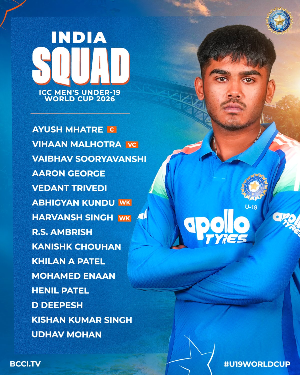 भारतीय अंडर-19 टीम (वर्ल्ड कप 2026) : आयुष म्हात्रे (कप्तान), विहान मल्होत्रा (उप-कप्तान), वैभव सूर्यवंशी, ऐरन जॉर्ज, वेदांत त्रिवेदी, अभिज्ञान कुंडू (विकेटकीपर), हरवंश सिंह, आरएस अम्बरीश, कनिष्क चौहान, खिलन ए पटेल, मोहम्मद ईनान, हेनिल पटेल, देवंद्रन दीपेश, किशन कुमार सिंह और उधव मोहन