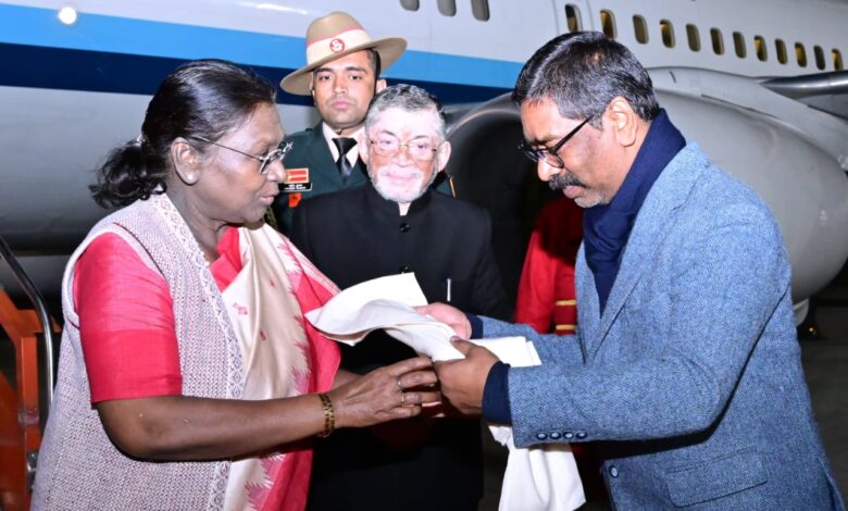 रांची : राष्ट्रपति द्रौपदी मुर्मु अपने तीन दिवसीय झारखंड दौरे के तहत रविवार की शाम रांची पहुंच गईं। वह विशेष विमान से बिरसा मुंडा एयरपोर्ट पहुंचीं, जहां राज्यपाल संतोष कुमार गंगवार और मुख्यमंत्री हेमंत सोरेन ने उनका गर्मजोशी से स्वागत किया। इस अवसर पर मुख्यमंत्री ने राष्ट्रपति को प्रतीक चिन्ह भेंट कर सम्मानित किया।