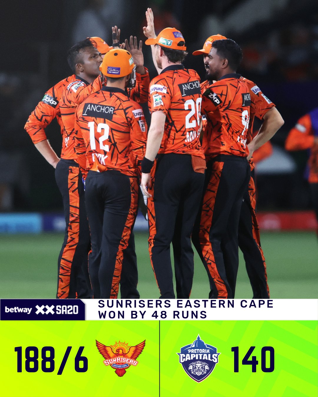 आक्रामक बल्लेबाज क्विंटन डीकॉक ने 77 रन की तूफानी पारी खेली जिससे सनराइजर्स ईस्टर्न केप ने एसए20 क्रिकेट टूर्नामेंट में प्रिटोरिया कैपिटल्स को 48 रन से हराकर बोनस अंक हासिल किया।