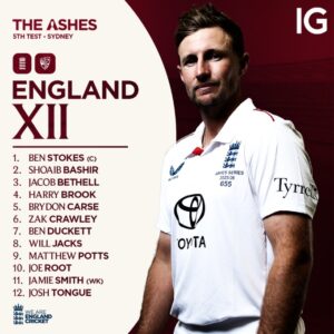 पांचवां एशेज टेस्ट (इंग्लैंड टीम) : बेन स्टोक्स (कप्तान), शोएब बशीर, जैकब बेथेल, हैरी ब्रूक, ब्रायडन कार्स, ज़ैक क्रॉली, बेन डकेट, विल जैक्स, मैथ्यू पॉट्स, जो रूट, जेमी स्मिथ (विकेटकीपर), जोश टंग