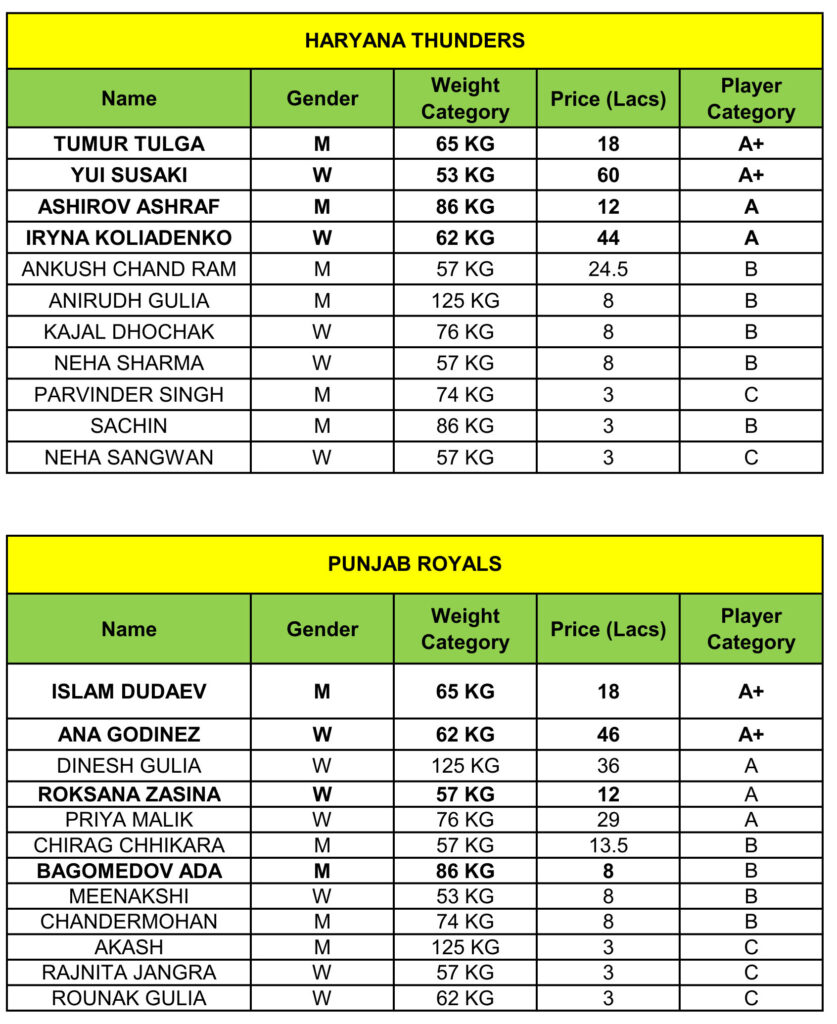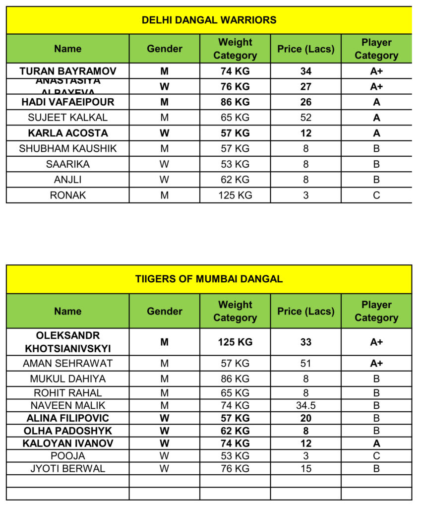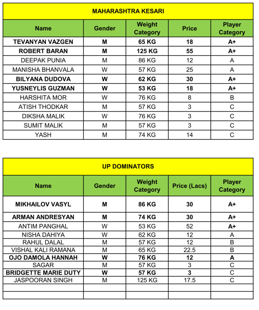 चयनित पहलवानों में ओलंपिक और विश्व चैंपियन, ओलंपिक एवं विश्व चैंपियनशिप पदक विजेता, महाद्वीपीय चैंपियन और बीच रेसलिंग चैंपियन भी शामिल हैं। यूपी डोमिनेटर्स सबसे अधिक खर्च करने वाली फ्रेंचाइज़ी रही, जिसने अपने 2 करोड़ रुपये के पर्स में से 1.94 करोड़ रुपये खर्च किए, जबकि दिल्ली दंगल वॉरियर्स के पास सबसे अधिक 22 लाख रुपये शेष रहे।