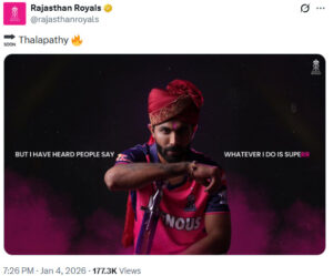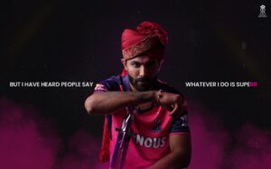 पोस्टर पर लिखा है: “लेकिन मैंने सुना है कि लोग कहते हैं कि मैं जो भी करता हूं वो सुपर होता है।” ध्यान देने वाली बात यह है कि शब्द “सुपर” की स्पेलिंग में आखिर में एक अतिरिक्त ‘R’ जोड़ा गया है और राजस्थान शब्द टीम की पिंक जर्सी के रंग में हाइलाइट किया गया है, जबकि बाकी टेक्स्ट सफेद रंग में है।