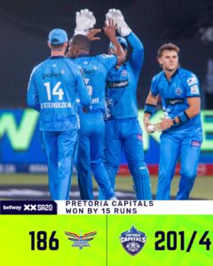 इन प्रदर्शनों के दम पर प्रिटोरिया कैपिटल्स ने डरबन सुपर जायंट्स (डीएसजी) को 15 रन से शिकस्त दी। मैच में पहले बल्लेबाजी करते हुए कैपिटल्स ने चार विकेट खोकर 201 रन का विशाल स्कोर खड़ा किया। इस मजबूत स्कोर की नींव शाई होप की शानदार नाबाद पारी ने रखी, जिसमें उन्होंने 118 रन बनाए।