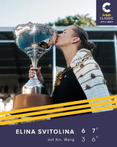 रविवार को ऑकलैंड में खेले गए एएसबी क्लासिक के फाइनल में उन्होंने चीन की सातवीं वरीयता प्राप्त वांग शिनयू को 6-3, 7-6 से मात देकर अपने करियर का 19वां डब्ल्यूटीए टूर खिताब जीता। यह 13वीं रैंकिंग की स्वितोलिना का कुल 24 फाइनल मुकाबलों में 19वां खिताब रहा।