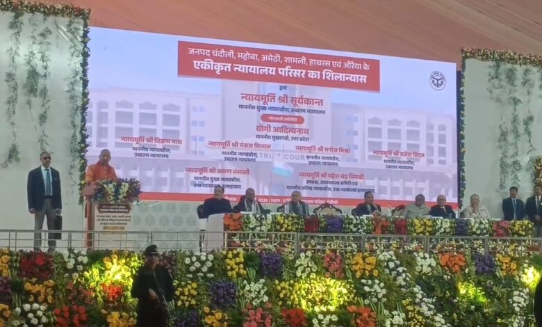 चंदौली : उच्चतम न्यायालय के मुख्य न्यायाधीश (सीजेआई) जस्टिस सूर्यकांत ने शनिवार को उत्तर प्रदेश के जनपद चंदौली, महोबा, अमेठी, शामली, हाथरस और औरैया के एकीकृत न्यायालय परिसर (इंटीग्रेटेड कोर्ट कॉम्प्लेक्स) का शिलान्यास किया। इस दौरान प्रदेश के मुख्यमंत्री योगी आदित्यनाथ भी मौजूद रहे। कार्यक्रम में इलाहाबाद उच्च न्यायालय के मुख्य न्यायाधीश अरुण भंसाली, उच्चतम न्यायालय के पांच तथा इलाहाबाद उच्च न्यायालय के 18 न्यायाधीश भी उपस्थिति रहे।