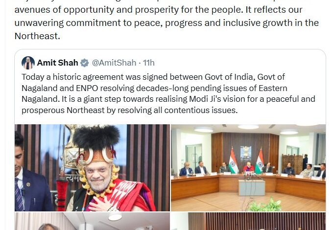 प्रधानमंत्री मोदी ने लिखा, “यह वास्तव में एक ऐतिहासिक समझौता है। यह विशेष रूप से पूर्वी नागालैंड के विकास की गति को बढ़ाएगा। मुझे यकीन है कि यह लोगों के लिए अवसर और समृद्धि के नए रास्ते खोलेगा। यह पूर्वोत्तर में शांति, प्रगति और समावेशी विकास के प्रति हमारी अटूट प्रतिबद्धता को दर्शाता है।” उल्लेखनीय है कि यह समझौता केंद्रीय गृह एवं सहकारितामंत्री अमित शाह और नागालैंड के मुख्यमंत्री नेफ्यू रियो की उपस्थिति में हुआ। यह समझौता नागालैंड के छह जिलों, तुएनसांग, मोन, किफिरे, लोंगलेन्ग, नोकलाक और शमाटोर के लिए फ्रंटियर नागालैंड टेरिटोरियल अथॉरिटी (एफएनटीटीए) के गठन और एफएनटीटीए को 46 विषयों के संबंध में शक्तियों के हस्तांतरण का मार्ग प्रशस्त करता है।
