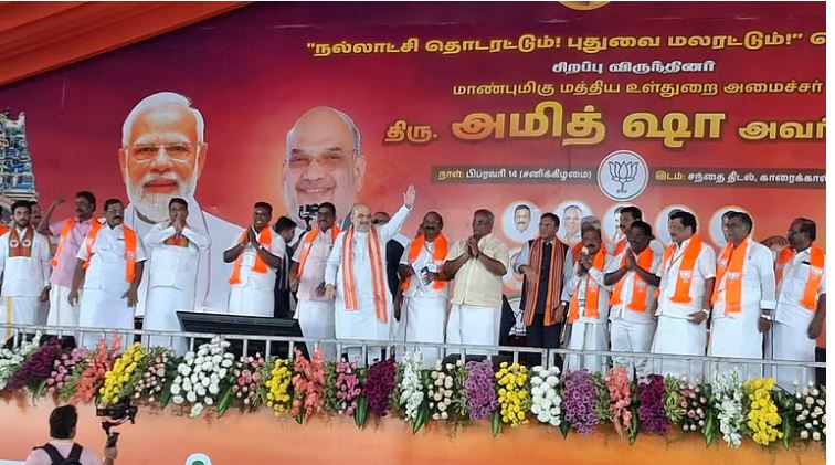 कारैक्कल : केंद्रीय गृह मंत्री अमित शाह ने शनिवार को पुडुचेरी के कारैक्कल में आयोजित भारतीय जनता पार्टी (भाजपा) की जनसभा को संबोधित करते हुए दावा किया कि आगामी 2026 विधानसभा चुनाव में राष्ट्रीय जनतांत्रिक गठबंधन (राजग) 60 प्रतिशत मत हासिल कर पुडुचेरी की सभी 24 सीटें जीतेगा। उन्होंने पुडुचेरी की जनता से राष्ट्रीय जनतांत्रिक गठबंधन (राजग) को निरंतर समर्थन देने की अपील की।