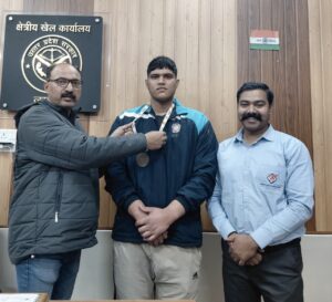 लखनऊ। केडी सिंह बाबू स्टेडियम के वेट लिफ्टिंग प्रशिक्षु व सीनियर खिलाड़ी इकबाल चन्द्र को बुधवार को क्षेत्रीय क्रीड़ा अधिकारी (आरएसओ) लखनऊ ने अपने कार्यालय में सम्मनित पदक पहनाकर व नगद पुरस्कार से सम्मानित किया। इस मौके पर इकबाल चन्द्र के कोच व उपक्रीड़ा अधिकारी अरबिन्द कुशवाहा मौजूद रहे।