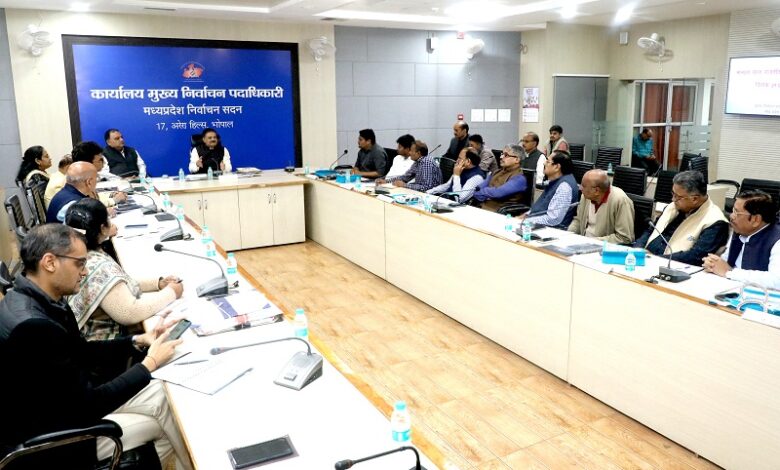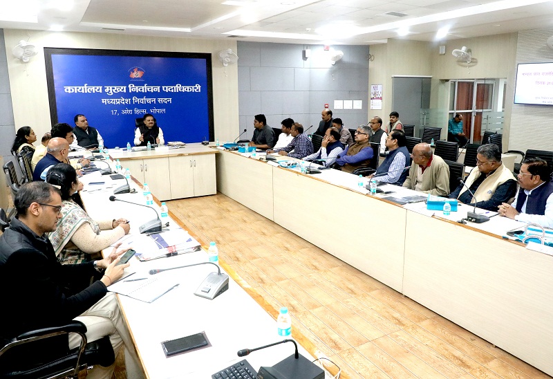 प्रदेश के मुख्य निर्वाचन पदाधिकारी संजीव कुमार झा ने शनिवार को निर्वाचन सदन भोपाल में मान्यता प्राप्त राष्ट्रीय राजनीतिक दलों के प्रतिनिधियों के साथ बैठक कर उन्हें मतदाता सूची के विशेष गहन पुनरीक्षण (एसआईआर) 2026 के अंतर्गत प्रकाशित अंतिम मतदाता सूची के संबंध में विस्तृत जानकारी दी।