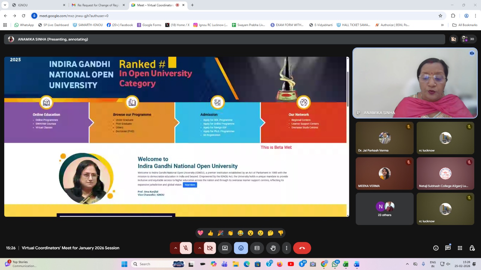 लखनऊ: इंदिरा गांधी राष्ट्रीय मुक्त विश्वविद्यालय, क्षेत्रीय केन्द्र, लखनऊ द्वारा डिजिटल माध्यम से शिक्षा प्रदान करने एवं जनवरी 2026 सत्र में प्रवेश के सम्बन्ध में विमर्श करने के उद्देश्य से अध्ययन केन्द्रों के प्राचार्यों, समन्वयकों एवं सहायक समन्वयकों के लिए वर्चुअल मीटिंग का आयोजन दिन बुधवार, दिनाँक 25 फरवरी 2026 को किया गया। इस मीटिंग में झांसी, कानपुर, बरेली, चित्रकूट, सीतापुर, अयोध्या, कानपुर देहात, अमेठी, शाहजहाँपुर, लखीमपुर (खीरी), बलरामपुर, बस्ती एवं लखनऊ जिलों में स्थित इग्नू के अध्ययन केन्द्रों के 50 से अधिक प्रतिनिधियों ने भाग लिया।
