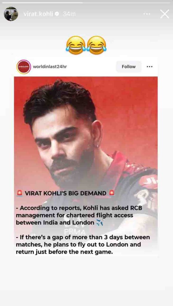 कोहली ने इन दावों वाली एक रिपोर्ट का स्क्रीनशॉट अपनी स्टोरी पर शेयर किया और साथ में लाफिंग इमोजी (हंसने वाली इमोजी) लगाई। कोहली पिछले कुछ समय से अपने परिवार के साथ लंदन में ही वक्त बिता रहे हैं।