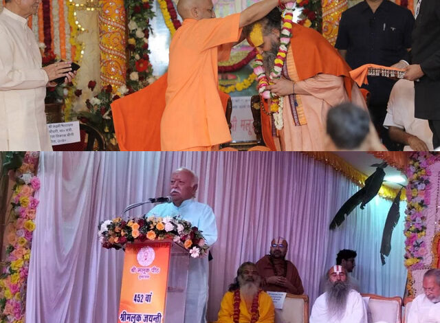 संघ के सरसंघचालक डाॅ मोहन भागवत मंगलवार को वृंदावन स्थित मलूकपीठ आश्रम में संत मलूकदास महाराज के 452वें जयंती महोत्सव का याेग गुरु बाबा रामदेव के साथ दीप प्रज्ज्वलित कर शुभारंभ करने के बाद संबाेधित कर रहे थे। इससे पहले उन्होंने संत शिरोमणि मलूकदास महाराज की समाधि पर पूजा-अर्चना की और वहां की पवित्र रज को माथे से लगाया। मुख्यमंत्री योगी आदित्यनाथ भी जगद्गुरु संत मलूकदास की 452वीं जयंती महोत्सव में शाम के समय शामिल हुए।