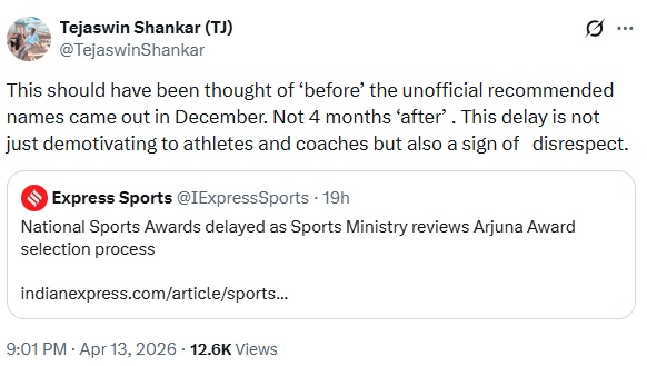 तेजस्विन ने एक्स पर लिखा, “दिसंबर में अनाधिकारिक नाम सामने आने से ‘पहले’ इस बारे में सोचा जाना चाहिए था, 4 महीने बाद नहीं। यह देरी न सिर्फ एथलीट्स और कोचों को हतोत्साहित कर रही है बल्कि अपमान की निशानी भी है।”