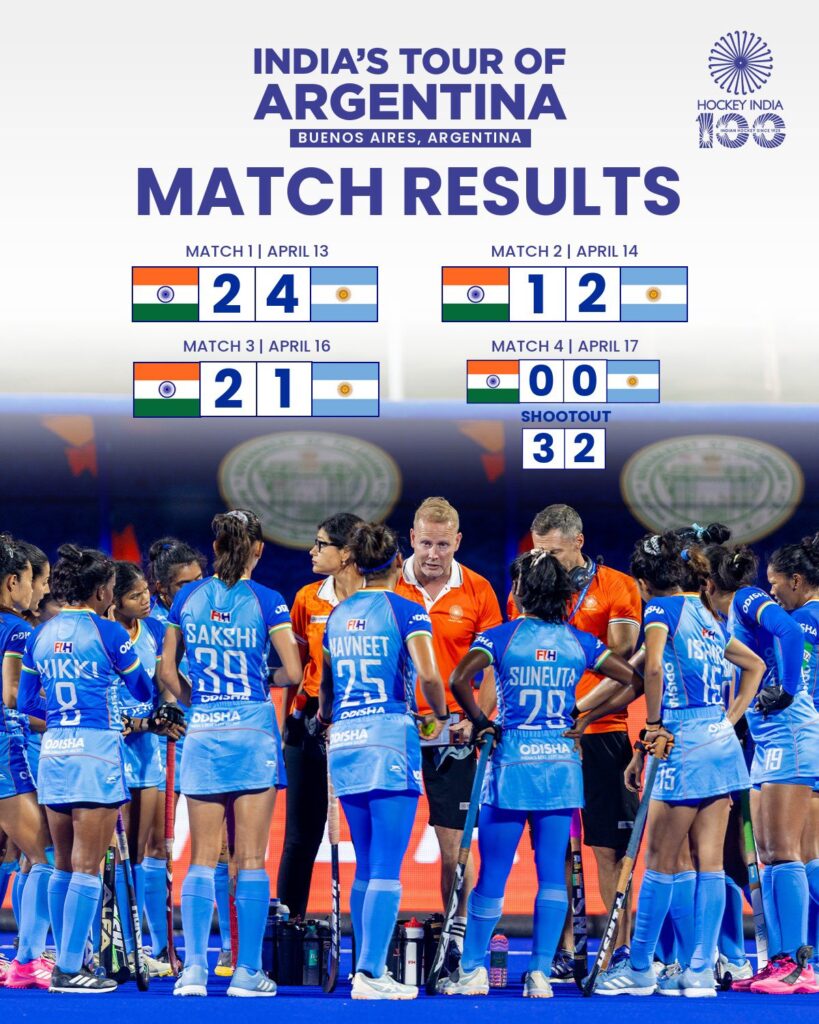 भारतीय महिला हॉकी टीम ने अर्जेंटीना के खिलाफ खराब शुरुआत के बाद शानदार वापसी करते हुए आखिरी दो मैच जीतकर श्रृंखला को 2-2 से बराबरी पर खत्म किया। दौरे की शुरुआत 13 अप्रैल को पहले मैच से हुई, जिसमें अर्जेंटीना ने 4-2 से जीत दर्ज की।