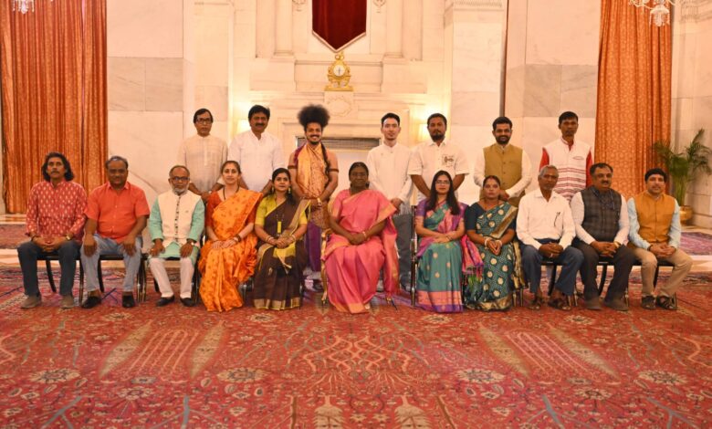 नई दिल्ली : राष्ट्रपति द्रौपदी मुर्मु ने गुरुवार को राष्ट्रपति भवन में पारंपरिक कला रूपों के कलाकारों के एक समूह से मुलाकात की और उनके कला कार्यों को देखा।