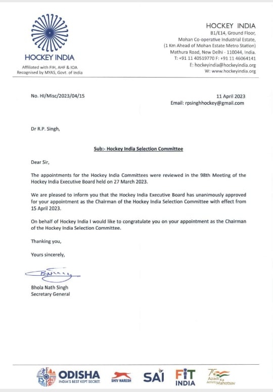 वहीं द इंडियन व्यू के पास वो पत्र मौजूद है जिसको हॉकी इंडिया ने डॉ. आरपी सिंह को चयन समिति के अध्यक्ष बनाये जाने की सूचना दी गई है। उधर डॉ. आरपी सिंह ने द इंडियन व्यू से खास बातचीत में कहा है कि अब उनके ऊपर एक बड़ी जिम्मेदारी है। उन्होंने कहा कि हॉकी को लेकर फिर से युवाओं में जोश भरना है। डॉ. आरपी सिंह ने कहा कि हाल के दिनों में भारतीय हॉकी ने शानदार प्रदर्शन किया है लेकिन अभी इसमें और सुधार की जरूरत है। जिसके लिए हर सम्भव प्रयास किया जायेगा।